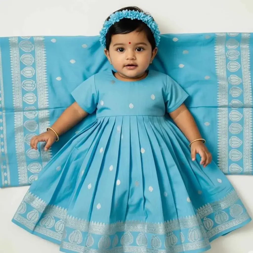 • Popular Styles: Look for designs inspired by classic Bengali weaves such as Dhakai Jamdani or Tant sarees, known for their intricate patterns and lightweight feel. These often feature beautiful borders and traditional motifs that add an authentic touch to the baby girl’s rice ceremony dress.
